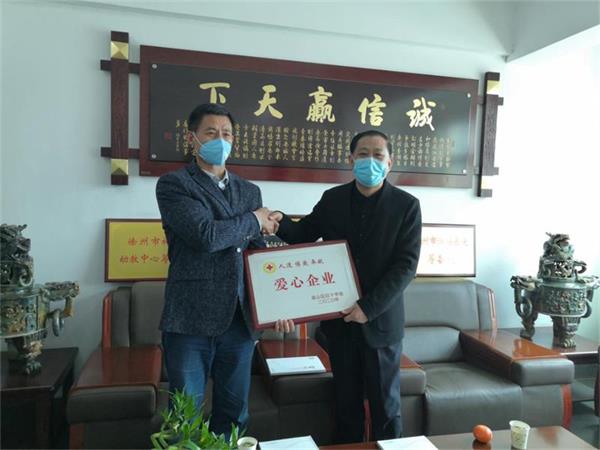 最后泉山区红十字会给爱体育app首页_爱体育(中国),颁发了爱心企业牌匾,并合影留念。