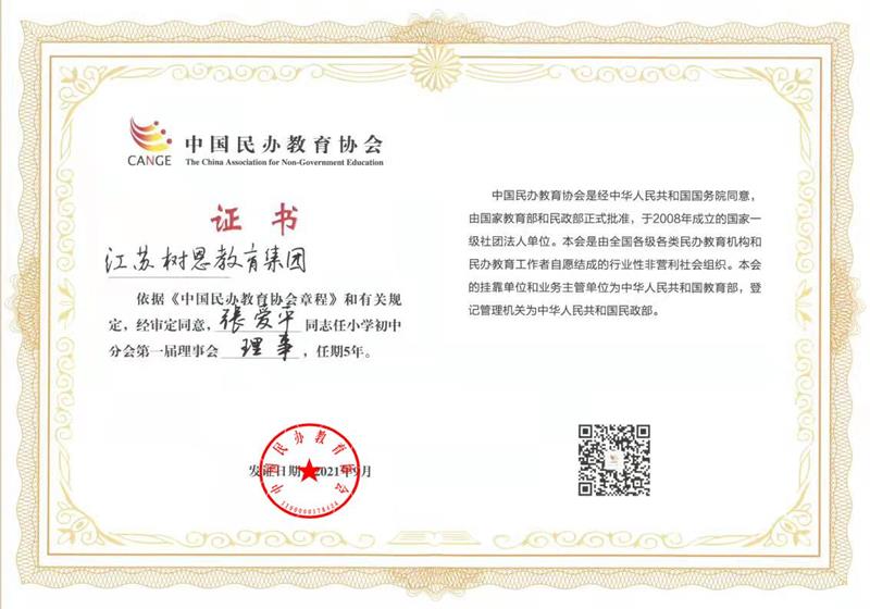 江苏树恩教育集团荣获中国民办教育协会颁发的理事证书