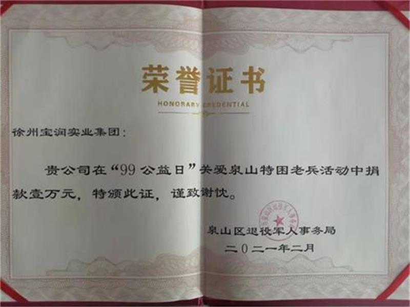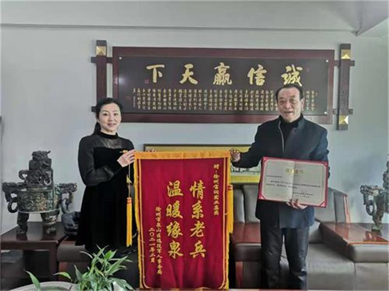 “情系老兵,温暖缘泉”,泉山区退役军人事务局特于2021年2月向集团颁发了荣誉证书与锦旗。